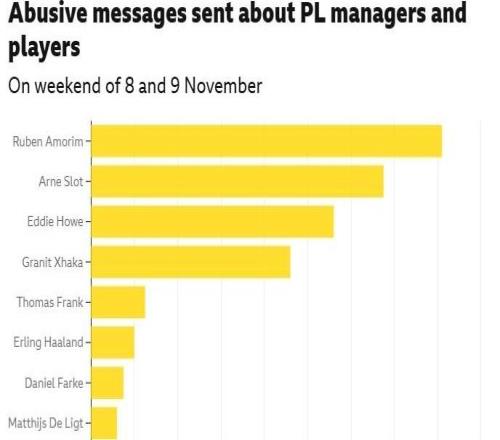 英媒调查:英超第11轮期间阿莫林、斯洛特遭最多网络攻击 -