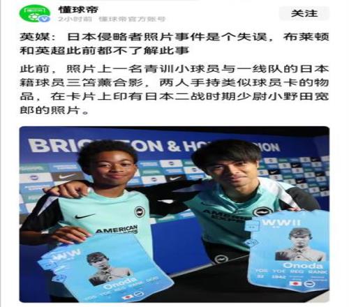 日本国脚竟拿“战犯”照片合影,英超球队道歉:向对中国造成的任何冒犯诚挚道歉 -