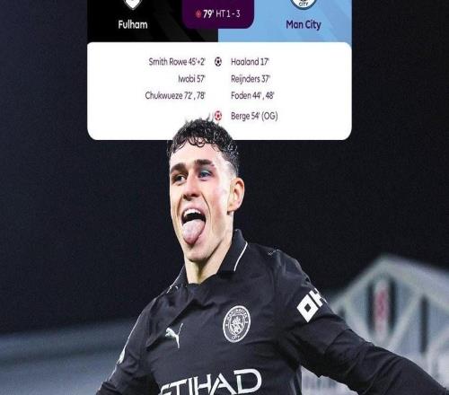 热闻福登连场双响,哈兰德收获英超百球!曼城客场54险胜富勒姆 -